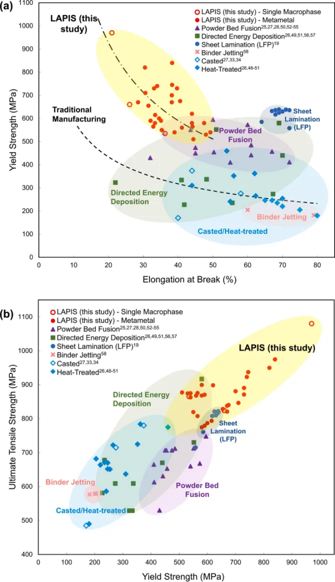 图6.比较图显示了SS 304 L的(a)0.2%屈服强度和断裂伸长率,以及(b)极限拉伸强度和0.2%屈服强度,通过LAPIS、传统工艺(如铸造和热处理)以及其他增材制造技术(包括粉末床熔合、定向能量沉积、片材层压(LFP)和粘合剂喷射。子图(a)中的虚线表示通过传统非AM工艺和本研究中制造的部件的强度-延展性权衡,其使用逆幂律回归线单独计算。