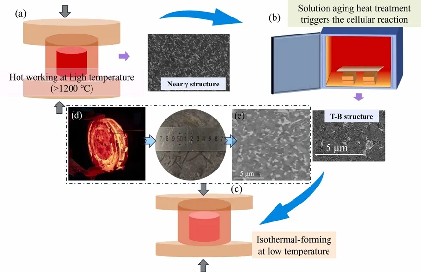 近日,宝钛股份与西工大团队提出通过胞状反应构建新型三相双态(T-B)结构,成功突破TiAl合金热成形极限。相较于传统组织,T-B结构将DRX温度降低至少250℃,首次实现800℃下60%工程应变的无裂纹压缩变形(钛铝金属间化合物领域创纪录),并制备出0.8μm超细晶粒。机制研究表明:T-B结构中的类珠光体组织(PM)通过高位错密度提供强应变硬化能力,在低温条件下为DRX形核提供充足驱动力,促进超细晶形成;同时DRX有效消除应力集中,避免材料开裂。基于此,团队开发出免β合金化的TiAl合金低温热成形新工艺(800–1000℃),不仅规避传统β元素添加导致的脆化与蠕变风险,更显著降低高温氧化危害,为航空发动机核心部件制造开辟新路径。