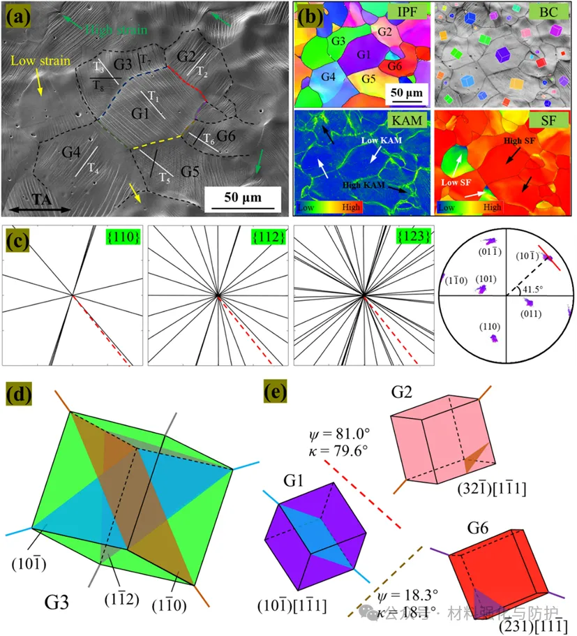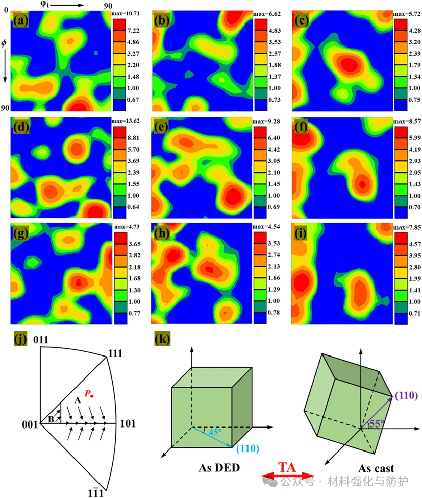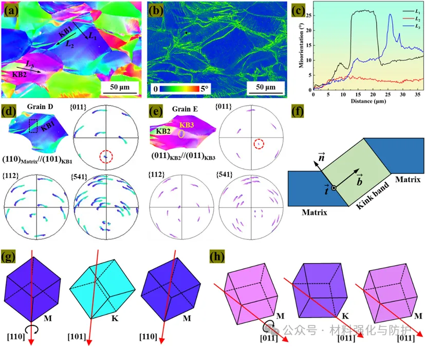 变形时样品会形成与基体取向差为~27°的扭折带,能通过晶格旋转实现晶格软化而提升塑性,且扭折带内可生成新扭折带进一步协调变形。多个滑移系被激活,柱状晶的几何相容性因子(m')更高,更容易发生滑移传递提升变形协调性。另外,DED制备的样品更容易形成<101>//拉伸轴的α纤维织构,促进位错运动与均匀塑性变形,而铸态样品无优先取向,织构强度低。