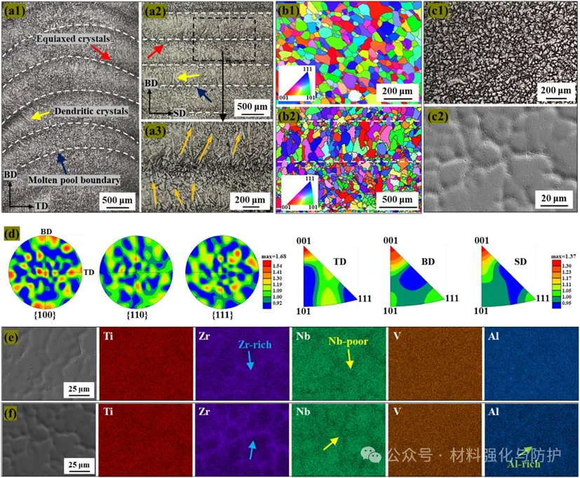 (a1-a3) DED样品的OM图像, (b1, b2) DED样品的IPF, (c1, c2) 铸态试样的OM和SEM图像, (d) 图2(a1)对应的纹理, (e) DED样品的EDS图像, (f) 铸态样品的EDS图像