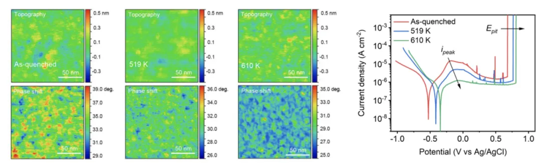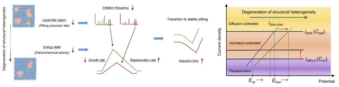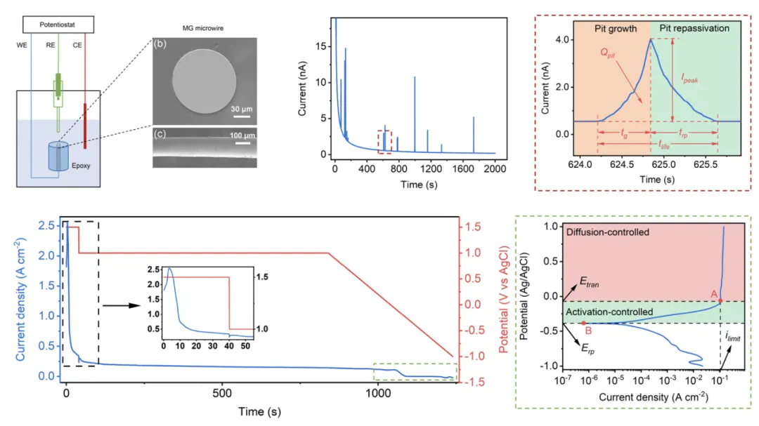 钴基非晶软磁材料具有超高的磁导率、极低的功耗等特性,广泛应用于弱磁传感器、精密测量设备及电磁防护等领域。但非晶软磁材料在含氯离子的环境中易诱发点蚀,制约其在海洋等极端环境领域的应用。 值得注意的是,非晶软磁材料是非晶合金的重要分支,其腐蚀行为也需在更广泛的非晶合金研究框架下理解。目前,有关非晶合金点蚀的研究都使用一维尺寸在毫米级以上的常规电极。大面积的电极表面往往同时发生多个点蚀,导致信号相互重叠而难以区分。因此,常规电极表征的是电极表面整体的统计结果,难以获得点蚀生长的详细信息。此外,非晶合金的结构长程无序,其结构与性能的关联性一直是研究的难点。因此,有关非晶合金本征结构与点蚀生长的关联性,科学界长期缺乏系统性认知。 针对该问题,中国科学院宁波材料技术与工程研究所软磁材料及其应用技术团队采用微米级直径的钴基非晶合金丝作为微电极,成功实现对单个点蚀生长动力学过程的定量评价,包括亚稳态点蚀的生长和稳态转变的临界条件、以及稳态点蚀生长的扩散传质和活化溶解过程,首次揭示了非晶结构不均匀性对亚稳态点蚀和稳态点蚀这两个点蚀生长关键阶段的影响机制。研究发现: (1)热诱导的结构均质化抑制了亚稳态点蚀的诱发频率,减缓亚稳点蚀的生长速率,同时加速点蚀的再钝化速率,并降低亚稳点蚀向稳态点蚀的转变概率;点蚀抗性的提高得益于非晶结构均质化导致的点蚀前驱体活性位点的减少和电化学活性的降低。 (2)热诱导的结构均质化提高了再钝化电位和维持点蚀稳态生长所需的蚀坑临界溶液浓度,显著抑制无盐膜覆盖条件下活化控制的点蚀稳态生长;非晶合金结构不均匀性的改变不影响盐膜沉淀要求的蚀坑溶液饱和浓度,因而对盐膜覆盖条件下扩散控制的点蚀稳态生长的抑制作用相对微弱。 上述工作为设计极端环境用非晶软磁材料提供理论指导。基于上述成果,团队开发出兼具优异软磁性能与高耐蚀性能的新型钴基非晶软磁材料,满足了海洋极端环境下的服役要求,为多种装备的弱磁探测和电磁防护提供了有力支撑。 图1 退火弛豫引起的结构均质化,提高钴基非晶软磁合金的点蚀抗性 图2 钴基非晶丝微电极表征亚稳态点蚀和稳态点蚀 图3 结构不均匀性对钴基非晶软磁合金点蚀生长的影响机制 相关成果 Corrosion Science Effect of structural heterogeneity on stable pit growth of Co-based metallic glasses DOI: 10.1016/j.corsci.2024.112032 Journal of Materials Science & Technology Correlation between metastable pitting and structural heterogeneity in Co-based metallic glasses DOI: 10.1016/j.jmst.2025.01.006