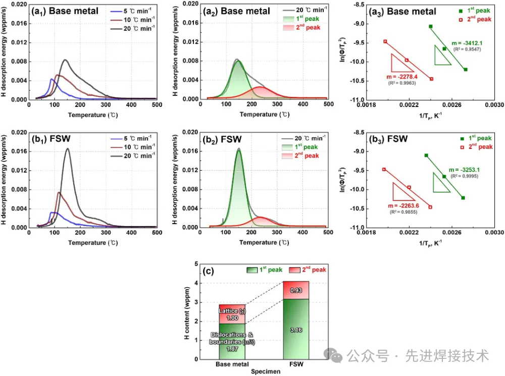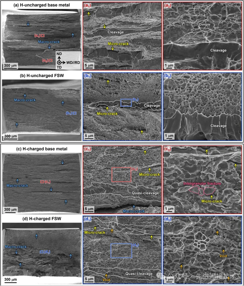 2025年4月,Tech University of Korea (TU Korea)的Kyo-Min Kwon等人在《Acta Materialia》上发表了《Dependence of friction-stir welding on mechanism of hydrogenembrittlement in medium-Mn steel with triplex-phase microstructure(搅拌摩擦焊对中锰钢氢脆机制影响-基于三相组织微结构的演化与氢行为分析)》一文。 研究背景 中锰钢(Medium-Mn Steel)由于具备良好的强韧性匹配、加工性以及成本优势,近年来在汽车轻量化、高强结构件中受到广泛关注。特别是三相组织(铁素体+马氏体+残余奥氏体)中锰钢,因其具备稳定的力学性能与氢扩散行为调控潜力,被视为抗氢脆候选材料之一。 氢脆(Hydrogen Embrittlement, HE)作为高强钢常见失效机制,其微观机制受到材料组织、位错密度、界面性质及氢陷阱行为的耦合影响。焊接过程中,热输入不仅引起材料组织变化,还可能改变氢在材料中的分布与陷阱状态,进而影响氢脆敏感性。 传统熔化焊热影响区(HAZ)组织严重变化、氢易聚集,造成抗氢脆性能下降。相比之下,搅拌摩擦焊(Friction Stir Welding, FSW)作为一种固态连接方法,可在低热输入下连接中高强钢,具有显著组织细化效应,并可抑制氢浓缩,为提升抗氢脆性能提供可能。因此,明确FSW在不同微区对氢行为及脆化机制的影响规律,对高强中锰钢焊接结构的服役可靠性提升具有重要意义。 试验方法 本文采用中锰三相组织钢(含10.6%Mn,1.1%Al,0.2%C),通过热处理获得兼具马氏体+铁素体+残余奥氏体的初始组织。采用常规FSW工艺(工具转速400 rpm,焊接速率100 mm/min)制备对接接头,并划分焊缝为三个区域:Base Material (BM)-母材;Thermo-Mechanically Affected Zone (TMAZ)-热-机械影响区;Stir Zone (SZ)-搅拌区。 随后,分别对不同区域进行以下表征与分析:EBSD观察组织演化;SIMS分析氢分布;热脱附(TDA)与应力腐蚀试验分析氢陷阱与断裂行为;数值建模估算氢扩散行为与应力分布。 研究结果与分析 1. 微观组织演化:强烈组织细化与相变行为 母材组织由较粗的马氏体+铁素体+残余奥氏体组成。FSW后:SZ区域出现极显著的晶粒细化(平均粒径~1.3 μm),同时残余奥氏体含量显著减少;TMAZ区域则保留部分奥氏体,组织呈现不均匀混合状态;EBSD显示,FSW诱发大量高角度晶界(HAGBs),有利于扩散但也可成为氢陷阱。 图1. Fe-8Mn-0.2C-3Al-1.3Si(质量分数)钢中母材与FSW焊缝样品的EBSD结果:(a1 与 b1) IQ-相图;(a2 与 b2) GOS图;(a3 与 b3) γR残余奥氏体的IQ-KAM图;(a4 与 b4) α/δ铁素体的IQ-KAM图。(c) 晶粒尺寸分布,(d) 各相比例,(e) 动态再结晶/未再结晶晶粒比例,(f) 平均KAM值与单位面积低角度晶界(LABs, 2° ≤ θ ≤ 15°)总长度(μm⁻¹)的变化情况。在IQ-相图/GOS图中,黑色和蓝色线分别表示高角度晶界(θ > 15°)与低角度晶界(LABs);黄色箭头标示位错胞(dislocation cell)。ND:法向方向;RD:轧制方向;WD:焊接方向。 2. 氢浓度与分布:SZ区氢含量显著降低 通过二次离子质谱(SIMS)分析可得:氢在母材与TMAZ区域集中显著,在SZ区域则几乎检测不到高氢含量;TDA结果表明:SZ区域的高温脱附峰显著减少,说明FSW抑制了深陷阱的生成(如马氏体位错网络与奥氏体-马氏体界面)。 这一变化表明:组织细化与奥氏体减少,使氢陷阱减少,氢更难富集于SZ区域,从而提升抗氢脆性能。 图2在5、10和20℃/min的加热速率下,充氢(a1)基体和(b1)FSW试样的H解吸速率曲线◦C分钟-1。(a2和b2)加热速率为20℃/min时H解吸速率曲线的峰值分离,(a3和b3)作为加热速率函数的第一和第二峰的Kissinger图,以及(C)加热速率为20℃/min时,图2a2和b2中H解吸速率曲线中每个捕获位点的H含量 3. 力学与断裂行为:FSW显著改善氢致断裂韧性 母材在氢环境中表现出典型的脆性断裂行为,断口呈现准解理特征;而SZ区域在氢充入后仍表现出高的延展性与韧性,断口以韧窝为主;断裂多发生在TMAZ区域,成为潜在弱区,推测与氢局部富集及应力集中有关。 数值模拟也验证了该结果:TMAZ区域应力集中严重,氢扩散梯度最大,结合氢陷阱分布最可能导致氢脆失效。 图3 SSRT后(a1,2和b1,2)H-不带电和(c1,2和d1,2)H-charged试样的整体断裂面和放大图像:(a和c)基体金属和(b和d)FSW试样。ND:法线方向,TD:横向,WD:焊接方向,TA:拉伸轴 图4 具有多相组织的中锰钢在充氢过程中H扩散和捕获的(a1和b1)行为以及拉伸变形过程中H脆化的(a2和b2)断裂行为和相关机制的示意图:充氢(a1和a2)母材和(b1和b2)FSW试样,HEDE:H-增强脱粘,HELP:H-增强定位塑性,HESIV:H-增强应变诱导空位 主要结论 本研究系统探究了FSW对中锰三相钢氢脆敏感性及其机制的影响,结论如下: FSW可显著细化焊缝组织,降低RA含量,有效抑制氢陷阱形成;搅拌区(SZ)氢浓度最低,断裂韧性最高,表现出优异抗氢脆性能;TMAZ成为氢诱导失效的敏感区,需重点优化工艺或后处理;提出“区域化氢脆机制模型”,为多相高强钢焊接设计提供新理论基础; FSW为连接高强钢构件提供了一种低氢脆风险的新型工艺路径,尤其适用于对服役可靠性要求极高的结构件。