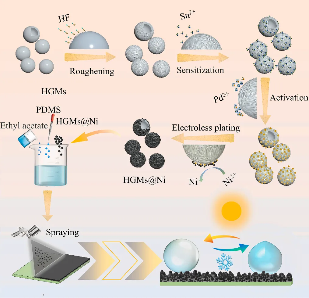 通过在中空玻璃微球(HGMs)上进行化学镀镍,然后与聚二甲基硅氧烷(PDMS)结合,通过喷涂法制得HGMs@Ni/PDMS涂层(简称为 HNP)。 所制备的HNP涂层具有优异的光热性能,在1000W·m−2的光照强度下,涂层表面温度可以在100秒内从20°C升高到66°C,除冰时间缩短了约220秒。HNP涂层还具有出色的隔热性能,减缓了涡轮叶片的热老化,同时有效抑制了液滴冻结过程中潜热的释放,使涂层在-10°C下的冻结时间接近40分钟。HNP涂层不存在层间粘结问题,表现出优异的机械性能。即使在反复磨损、水流冲击以及胶带剥离后,涂层仍然保持良好的防/除冰性能。此外,HNP涂层操作简单,原料成本低廉,适合于大面积制备。因此,本研究在风力发电领域中具有广阔的应用前景。 制备工艺 HNP的制备工艺。