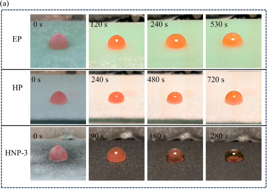 冰滴融化照片 EP、HP和HNP-3表面50μL冰滴在-10℃、1000W·m−2光照强度下融化的照片。