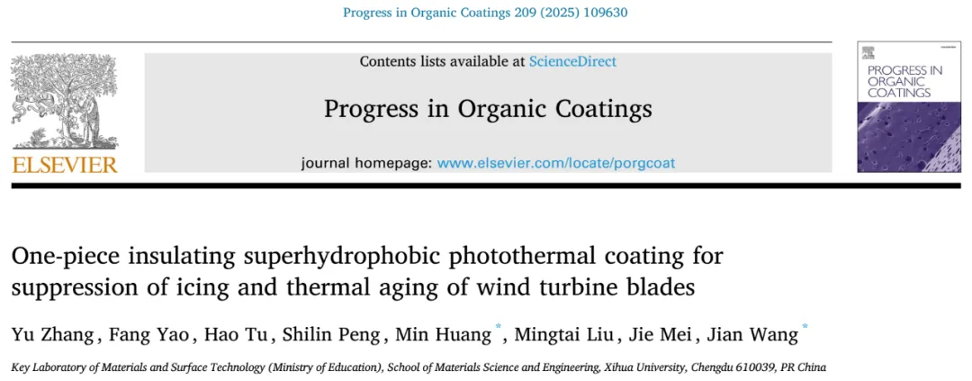 数据来源与出处 相关研究成果以“One-piece insulating superhydrophobic photothermal coating for suppression of icing and thermal aging of wind turbine blades”为标题发表在《Progress in Organic Coatings》上。