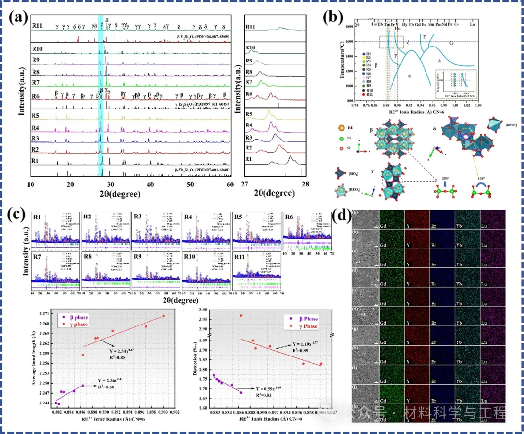 SiCf / SiC陶瓷基复合材料 (CMCs) 具有优异的机械性能和高温抗蠕变性能,成为高推重比航空发动机热端部件的理想候选材料。然而,SiC-CMCs的失效通常由暴露于高温腐蚀介质引起。因此,使用环境屏障涂层 (EBCs) 保护SiC-CMCs免受热腐蚀至关重要。高熵稀土二硅酸盐(nRE)₂Si₂O₇ 具有与SiC-CMCs相匹配的热膨胀系数,较低的热导率以及良好的损伤容限,是极具潜力的EBCs候选材料。目前合成 (nRE)₂Si₂O₇ 的关键挑战在于预测特定成分能否形成具有理想相和晶体结构的单相体系。然而,多种主RE3+离子在固溶体中的掺入不仅影响相组成,还会深刻改变晶体结构本身,进而影响晶格常数、晶格畸变和空位浓度等参数。因此,精确调控 (nRE)₂Si₂O₇ 的晶体结构对性能优化至关重要。