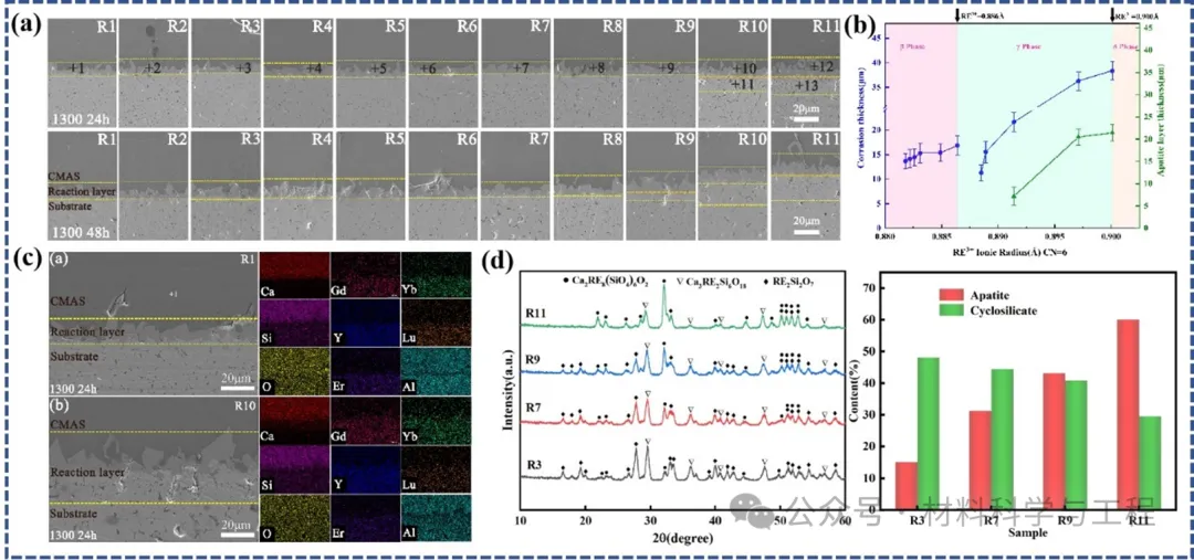 沈阳工业大学材料学院王占杰团队设计了十一种不同的高熵稀土二硅酸盐陶瓷体系,并探究了平均RE3+离子半径与高熵稀土二硅酸盐微观结构和耐CMAS腐蚀行为的关系。结果表明:随着平均RE3+离子半径的增大,这些材料的相组成逐渐从β型向δ型转变,同时各相区内的RE-O键长增加,[REO₆]晶格畸变程度也逐步降低。在1300°C条件下进行CMAS腐蚀实验时,通过反应沉淀机制可形成致密的环硅酸盐腐蚀产物层,其形成主要受相组成、RE-O键长及晶格畸变程度的共同调控。当温度升至1500°C时,晶界腐蚀与晶粒溶解成为主要腐蚀形式。此时由磷灰石和再沉淀的(5RExi)2Si2O7构成的腐蚀产物可通过溶解-沉淀机制生成,其腐蚀行为主要取决于平均RE³⁺离子半径。