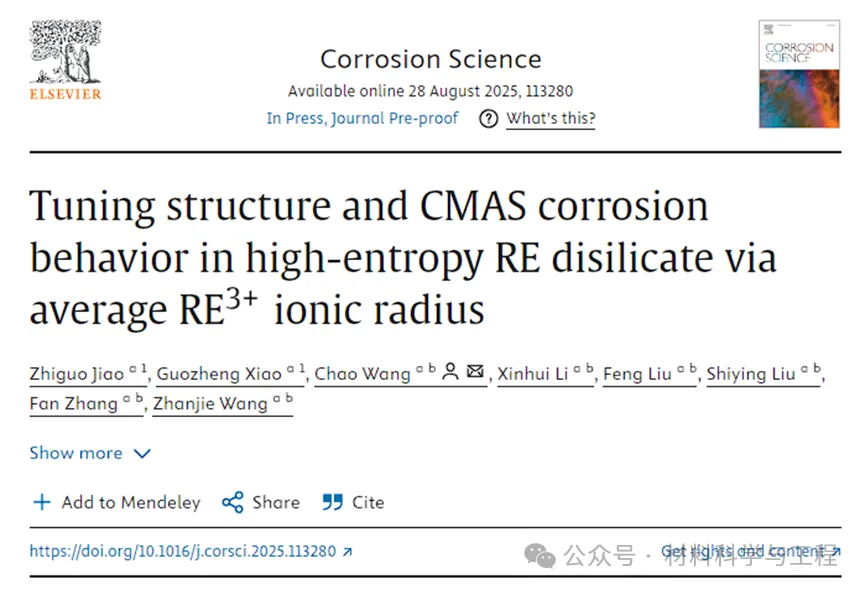 相关研究结果以题为“Tuning structure and CMAS corrosion behavior in high-entropy RE disilicate via average RE3+ ionic radius”发表在国际腐蚀领域顶刊Corrosion Science上。材料学院硕士研究生焦志国与肖国政为共同第一作者,王超副教授为本文的通讯作者。