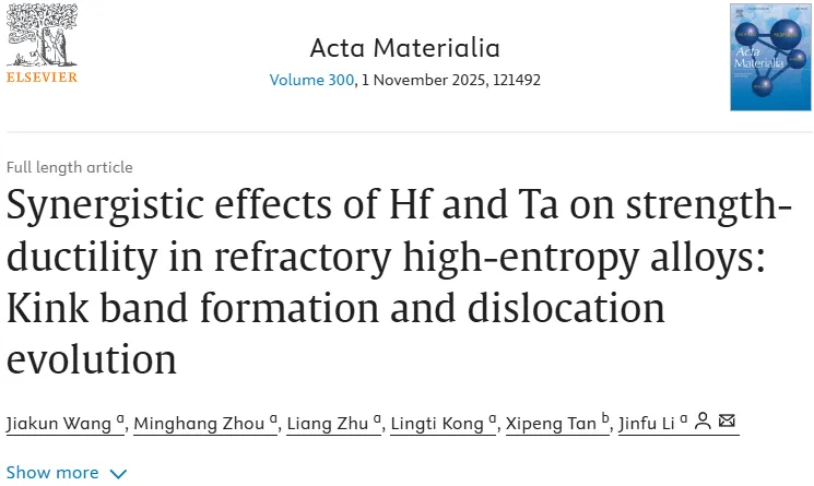 上海交通大学李金富教授团队于2025年8月29日在《Acta Materialia》期刊发表了题为“High-entropy alloys: kink band formation and dislocation evolution”的最新研究工作,研究团队深入探讨了高熵合金在塑性变形过程中的位错演化和扭折带的形成机制,并揭示了合金在复杂载荷下的微观结构调控规律,通过引入Hf-Ta协同设计,在Ti35Zr35Nb10Hf10Ta10难熔高熵合金中实现了强度与塑性的平衡。