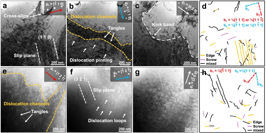 在屈服阶段,合金主要通过平面滑移变形,伴随少量交叉滑移。随着变形加深,位错缠结与短化现象明显,特别是边位错在扭折带边界处易于钉扎和累积,推动扭折带的形成。最终,材料的塑性由大量长直的边位错主导,这一异常机制区别于传统难熔合金中的螺位错主导。