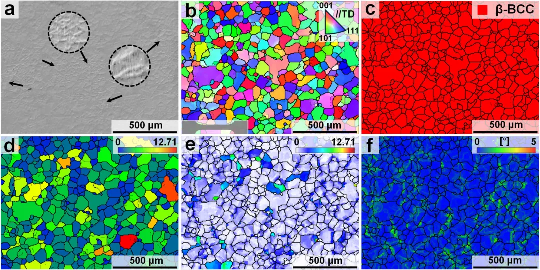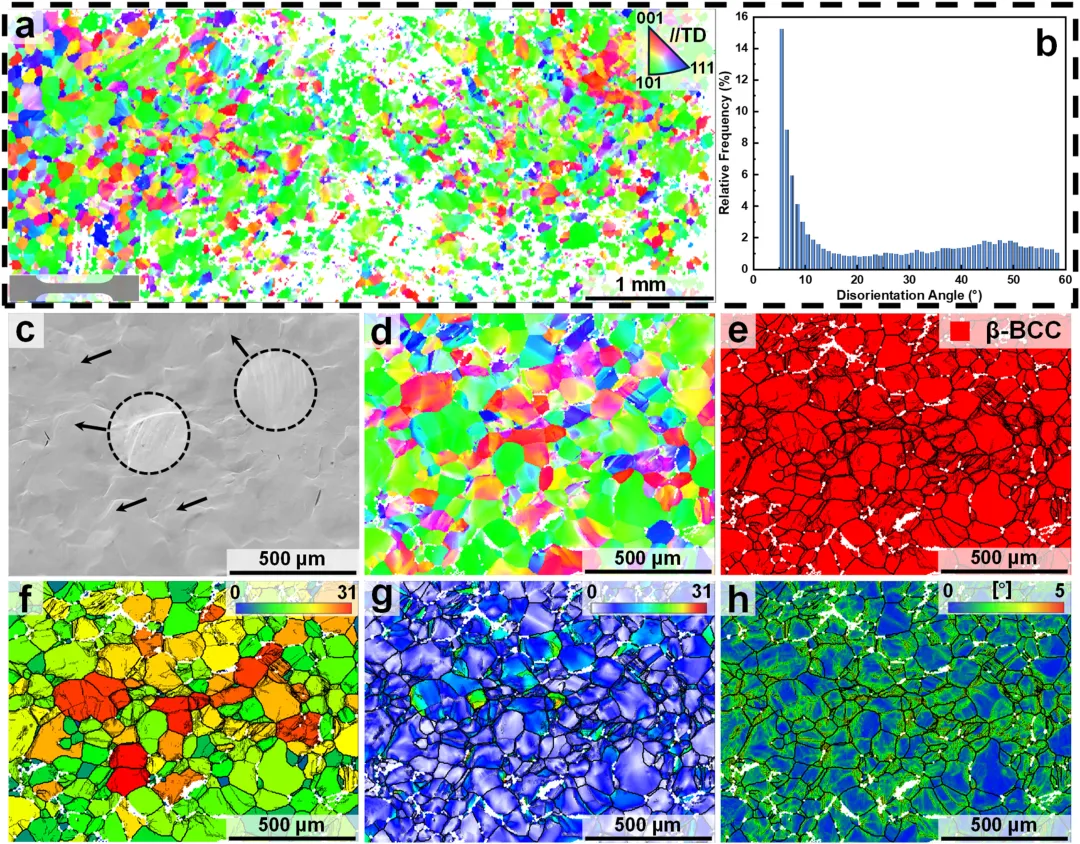 该研究系统分析了Ti-Zr-Nb-Hf-Ta合金的塑性变形机理,重点研究了Ti35Zr35Nb10Hf10Ta10合金在不同变形阶段的组织演变,系统地阐明了Hf和Ta在微观组织演化、强度-塑性协同作用、扭折带形成和位错相互作用中的作用,这一发现不仅推动了高熵合金的基础研究,也为航空航天、能源装备和生物医用金属的开发提供了新路径。