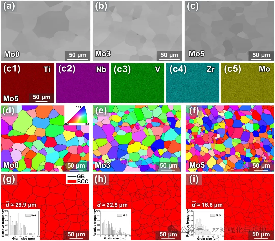 在引入Mo之后,合金依然保持单相体心立方结构,未观察到含Mo析出相,且随着含Mo量的增加,平均晶粒尺寸得到细化,Mo5(Ti40Nb30V20Zr5Mo5)的平均晶粒尺寸为16.6μm。