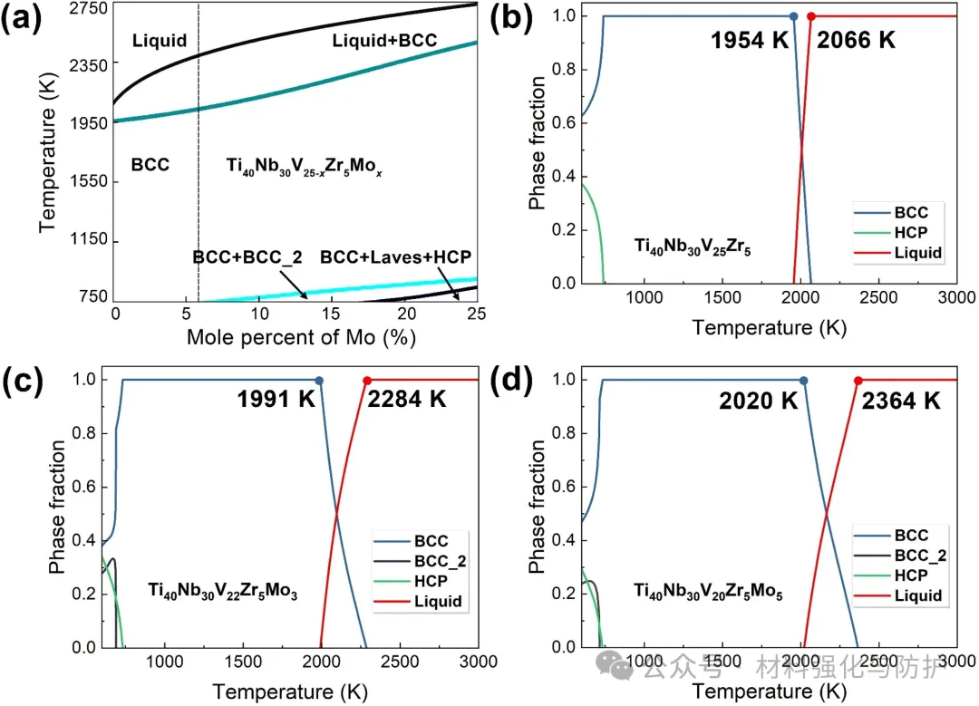 团队通过真空电弧熔炼法熔炼纯度≥99.95 wt.%的Ti、Nb、V、Zr和Mo的金属颗粒以此制备Ti40Nb30V25−xZr5Mox (x=0,3,5)合金,为了表征合金在高温条件下的力学性能变化,分别在室温与高温条件下进行拉伸试验,应变速率分别为5.6×10−4 s−1(室温)和1×10−3 s−1(高温),且测试均重复至少三次以保证可重复性,并使用纳米压痕机进行5×5压痕阵列的纳米压痕测试,结合DIC、SEM、EBSD、TEM以及CALPHAD相图计算与DFT模拟,深入揭示Mo在合金中的多重作用机制。