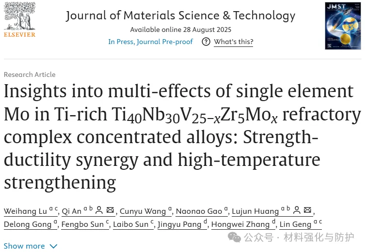 近日,哈尔滨工业大学团队联合中国科学院金属所,在《Journal of Materials Science & Technology》期刊在线发表了题为“Insights into multi-effects of single element Mo in Ti-rich Ti40Nb30V25−xZr5Mox refractory complex concentrated alloys: Strength-ductility synergy and high-temperature strengthening”的研究论文,在这项研究中,团队为了在保持轻质化和良好延展性的前提下提升Ti基RCCAs合金的力学性能,通过单一元素Mo的精准调控来调节合金的原子应变场、位错行为与电子结构。论文通讯作者为哈尔滨工业大学安琦副教授和黄陆军教授。