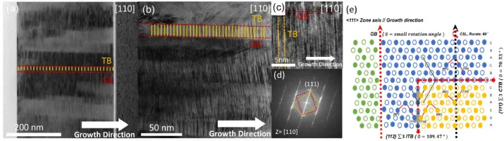 图 2. 从沉积态 HEA NT 薄膜中获得的 TEM 显微图像。(a) 显示柱状晶界和纳米孪晶的明场 TEM 图像。(b) 沿<111>生长方向的纳米孪晶放大 BFTEM 图像,(c) 纳米孪晶的高分辨率 TEM 图像,(d) 由(c)中图像获得的相应 FFT,(e) 是晶界和孪晶界附近原子排列的示意图。