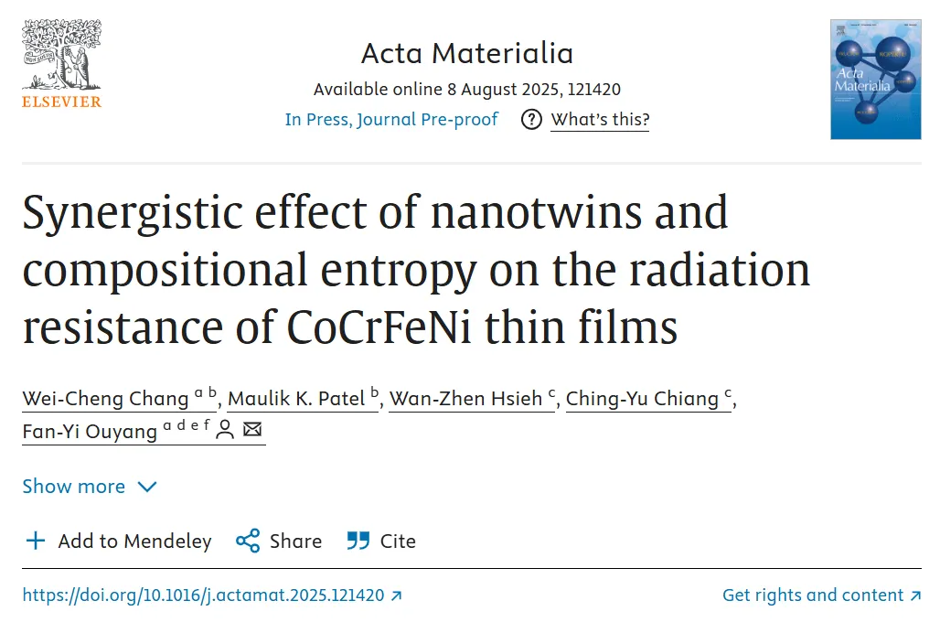 相关研究成果以“Synergistic effect of nanotwins and compositional entropy on the radiation resistance of CoCrFeNi thin films”发表在Acta Materialia上