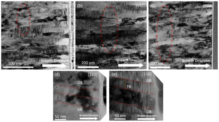 图 10. 从(a)沉积的薄膜和(b)用 5 × 10^12 He/cm^2、(c)1.5 × 10^13 He/cm^2 和(d)4.5 × 10^14 He/cm^2 He 离子辐照的样品中获得的 BFTEM,显示了晶粒倾斜。(e)晶粒倾斜结构的示意图。