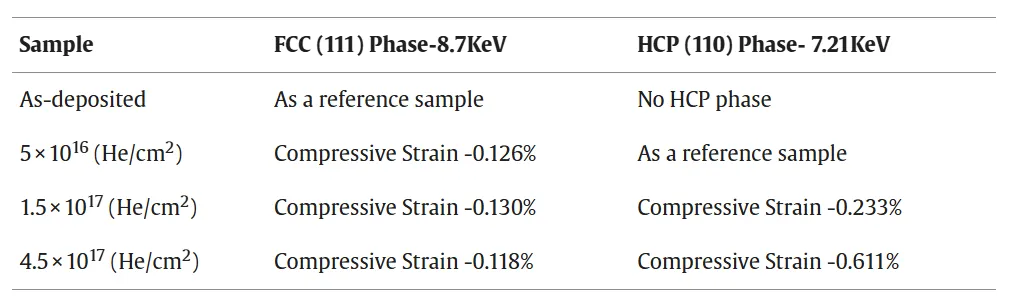 表 3. 通过同步辐射纳米衍射获得的 FCC 和 HCP 相中的应变变化,对于沉积的薄膜和分别辐照了 5 × 10^0, 1.5 × 10^1 和 4.5 × 10^2 He/cm^3 He 离子通量的样品。