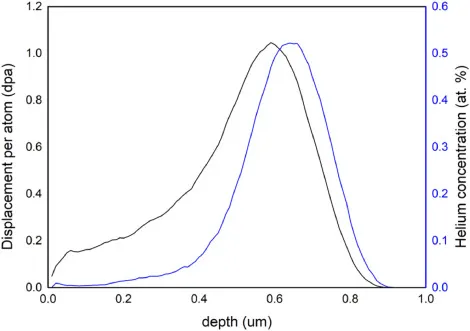 图 1. 使用 SRIM 模拟获得的 CoCrFeNi HEA 薄膜中,损伤(dpa)和氦原子浓度(%)随深度变化的估计值