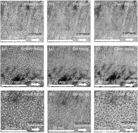图 4. 从注入了 (a-c) 5 × 10^6 He/cm^2、(d-f) 1.5 × 10^7 He/cm^2、(g-i) 4.5 × 10^8 He/cm^2 的 HEA NT 薄膜中获得的 BFTEM 显微照片,对应于 0.5、1.5 和 4.5 at. % 的估计 He 浓度,显示了聚焦良好、欠聚焦和过聚焦中 He 在气泡中的聚集。显微照片从 650nm 深度获取,该深度对应于 SRIM 估计的 275 keV He 离子的最大投影范围 [24]。