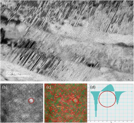 图 5. (a) 从植入 4.5 × 10^12 He/cm^2 的 HEA NT 薄膜中获得的 BFTEM 图像显示了无孪晶区域和氦气泡。(b) 沿 [0 1 1] 方向投影的晶粒的晶格图像。氦气泡在植入过程中形成。(c-d) 在 TEM 图像中进行几何相位分析 (GPA) 以评估氦气泡附近局部应变场。