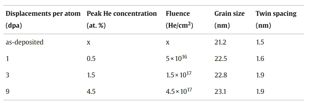 表 1. 通过透射电子显微镜(TEM)研究获得的 CoCrFeNi 高熵合金薄膜的晶粒尺寸和孪晶间距,作为不同离子注量(275 keV He 离子在室温下辐照)的函数。相应的位移每原子(dpa)和 He 离子浓度通过 SRIM 计算[25]估算。