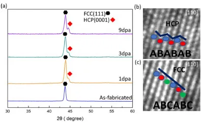 图 6. (a) 从沉积态和经过不同剂量 275 keV 氦离子辐照的 HEA 薄膜获得的 X 射线衍射图谱。(b) 从经过 4.5 × 10^12 离子/cm^2 氦离子辐照的 HEA 薄膜获得的 HRTEM 图像,显示 HCP 原子层堆垛。(c) 从原始 HEA 薄膜获得的 HRTEM 图像,显示 FCC 原子层结构。