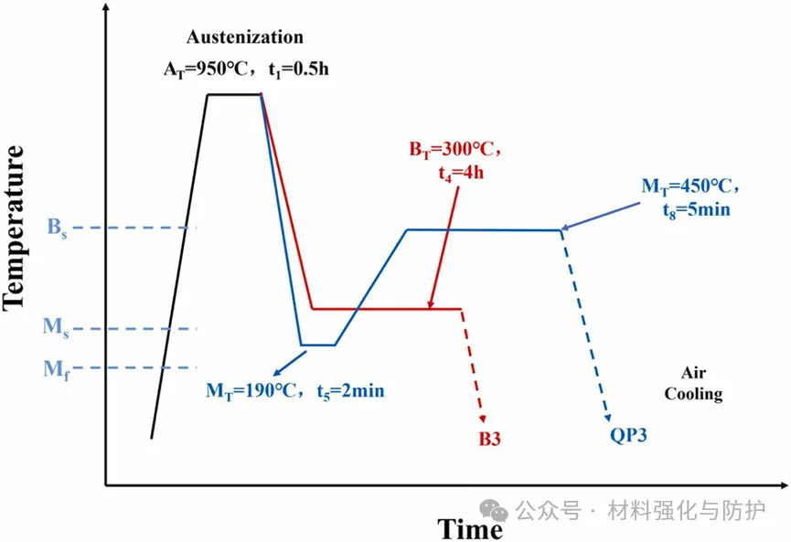 该研究围绕超细贝氏体(UFB)钢与淬火分区(Q&P)钢的应力腐蚀开裂行为,采用“材料制备-微观表征-性能测试-数值模拟”的综合研究方法,以成分为0.4C-1.50Si-1.50Mn-0.25Mo-0.016Nb-Fe(wt%)的钢为原料,通过差异化热处理获得UFB和Q&P钢。其中UFB钢在950℃奥氏体化30min,并在350℃保温4h后空冷获得,Q&P钢在950℃奥氏体化后在190℃淬火2min+450℃回火5min后空冷获得。