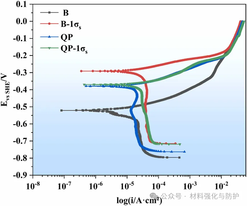 预应变后两种钢腐蚀电流密度均升高,其中UFB由1.976×10⁻⁵A・cm²升高为3.139×10⁻⁵A・cm²,Q&P由2.001×10⁻⁵A・cm²升高至2.894×10⁻⁵A・cm²。中性盐雾测试中,Q&P钢腐蚀速率高于UFB钢,且其锈层α/γ*更低、保护性更差,预应变进一步降低了两者的耐蚀性。