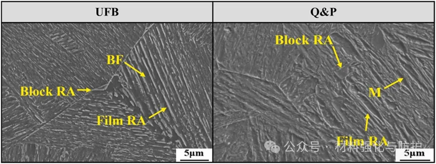 预应变通过TRIP效应使UFB钢和Q&P钢中的残余奥氏体(RA)含量分别从6.22%和5.25%降至1.77%和1.46%,位错密度与Σ3晶界含量升高,小于5μm的晶粒占比均超过92%。其中UFB钢微观结构更均匀,而Q&P钢中含有更多的低稳定性RA块体。