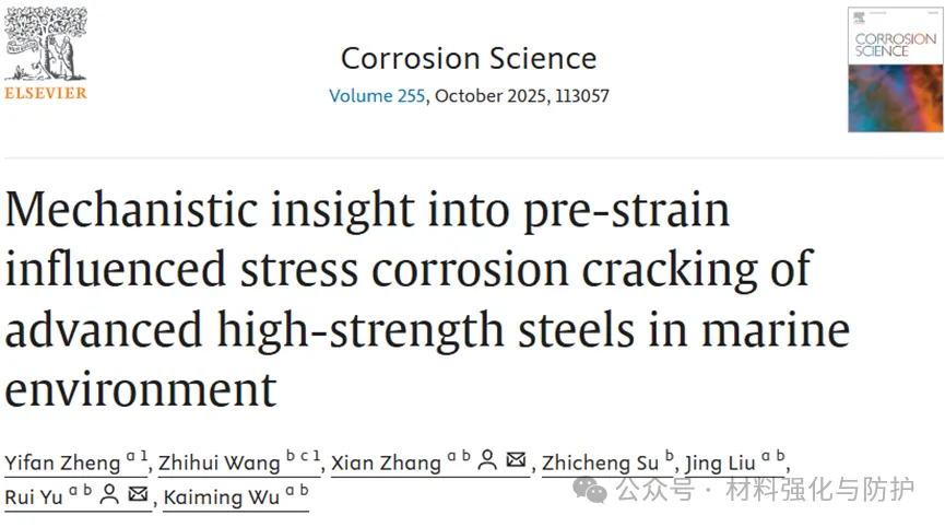近日武汉科技大学研究团队研究了相同成分的超细贝氏体钢和调质钢在预应变(1σS)下的应力腐蚀行为,明确了预应变通过TRIP效应改变微观结构对SCC的作用,发现Q&P钢SCC敏感性更高,并证实了电化学-力学耦合机制。相关研究结果以“Mechanistic insight into pre-strain influenced stress corrosion cracking of advanced high-strength steels in marine environment”为题被发表在了期刊《Corrosion Science》上。