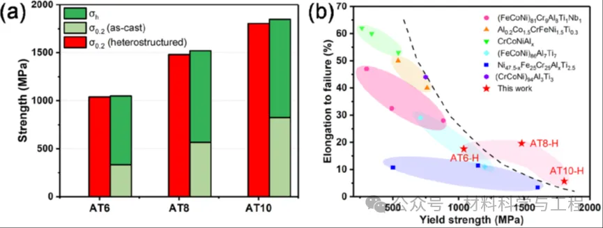 图5. (a) 计算得到的异质变形诱导(HDI)应力与实测屈服强度(YS)的对比图;(b) 本研究设计的复杂成分合金与现有复杂成分合金力学性能Ashby图。本研究设计的AT-8 合金展现出 1580 MPa屈服强度、1645 MPa 抗拉强度及~20% 断后伸长率的最优性能,突破了传统强度-塑性权衡关系。