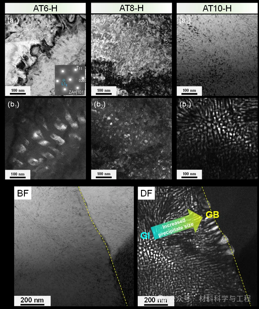 图4. AT6-H、AT8-H和AT10-H合金中沉淀相(a) 明场相;(b) 暗场相; (c) 典型晶内和晶界处沉淀相特征。随着沉淀相形成元素(Al, Ti)含量增加,沉淀相尺寸减小、体积分数增加(与同步辐射结果一致),且晶界处沉淀相尺寸显著大于晶内。