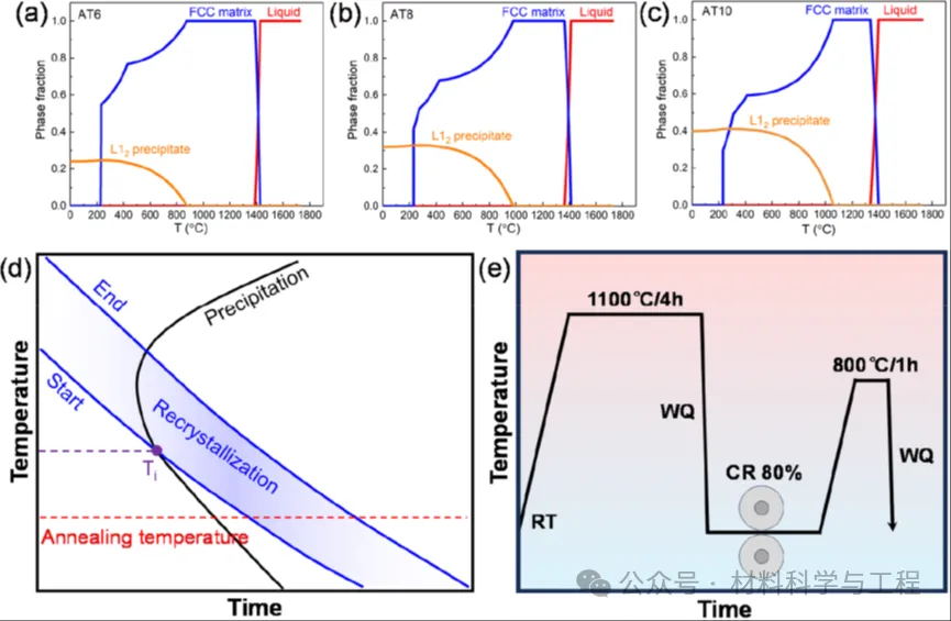 图2. (a)-(c)所设计的 AT6、AT8、AT10 合金的计算相图;(d) 退火温度选择原则的示意图;(e) 基于计算相图为三种实验合金设计的加工路线。