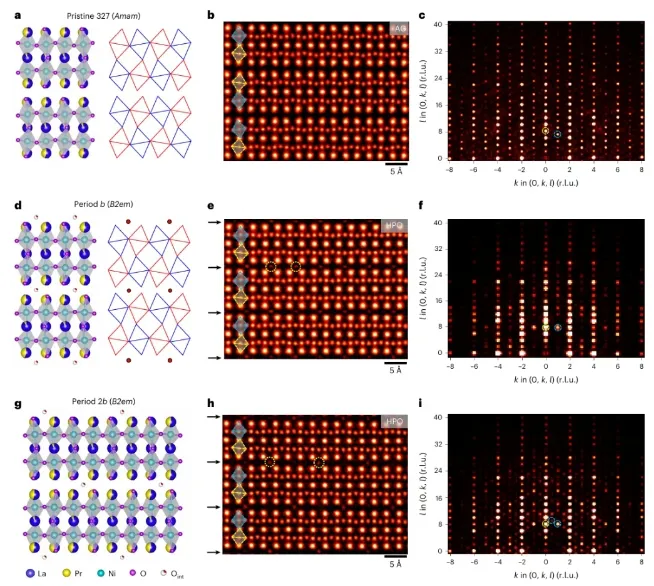 3:高压氧退火(HPO) 诱导形成stage-1型间隙氧有序结构,具有准一维条纹状排列。这种有序结构导致:晶格畸变(NiO₆八面体倾斜方向反转);引入额外空穴载流子(每个间隙氧贡献约2个空穴);抑制超导,即使在14 GPa高压下也无超导转变。这与铜酸盐中间隙氧增强超导的行为形成鲜明对比,凸显镍酸盐独特的电子结构。