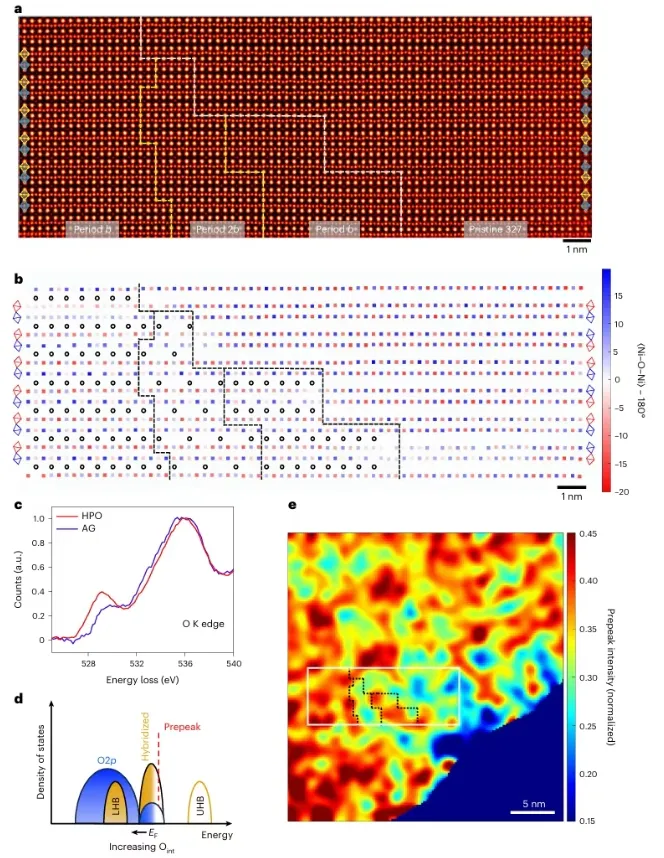 4:HPO样品中存在相分离:stage-1有序相(period-b 和 period-2b)与原始327相共存。EELS mapping显示空穴掺杂强度与间隙氧密度直接相关,且空间分布不均匀。这种相分离进一步解释了为何HPO样品中超导被抑制——有序相占据主导,且与超导相竞争。