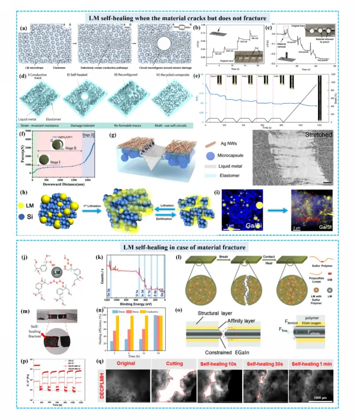 图1 液态金属自修复机制以及液态金属在自修复材料中的应用。