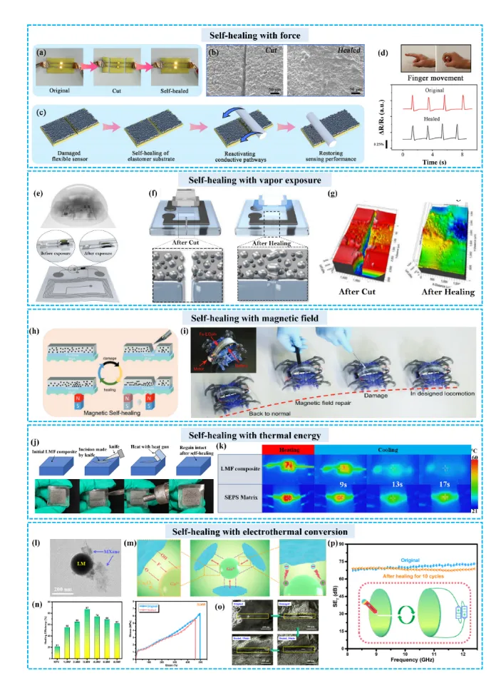 图5 需要外部场或额外物质参与的自修复原理图及应用示例。力场辅助自修复:(a) 与横截面接触时可重现的电性能照片;(b) 切片修复前后的扫描电子显微镜图像;(c) 借助特氟龙粘贴剂修复后的整体传感性能原理图;(d) 原始传感器和修复传感器测量的指关节移动阻力变化的原理图。蒸汽辅助自修复:(e) 蒸汽暴露前后聚合物溶剂转变的原理图;(f) 蒸汽辅助自修复的原理图;(g) 断裂愈合前后的光学轮廓仪图像。磁场辅助自修复:(h) 在磁场作用下Fe-EGaIn自修复的原理图;(i) 机器人在经过磁引导的受损导线修复后再次工作的照片。热能辅助自修复:(j) LMF复合材料热自修复过程的原理图及照片;(k) 通过红外热成像对比矩阵和LMF复合材料的散热结果。电热转化辅助自修复:(l) LM@MXene纳米复合材料的TEM图像;(m) LM与MXene之间两种界面相互作用的示意图;(n) 不同LM含量下的自我修复效率以及3LMW薄膜在修复前后的应力-应变曲线;(o) 在5V电压下,不同时间间隔下受损3LMW薄膜的自我修复过程的光学图像;(p) 6LMW薄膜在10次修复循环前后的EMI SE变化。