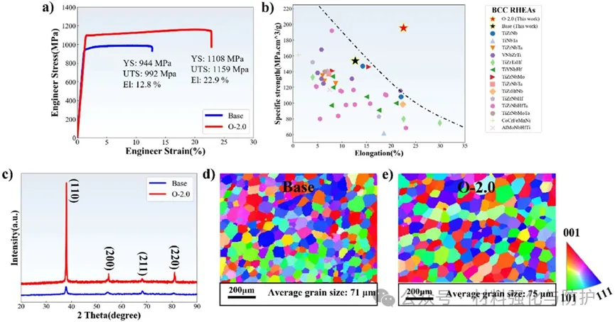对TiZrV0.5Nb0.5合金进行2at.%氧掺杂后,合金的屈服强度从944MPa提升到了1108MPa,拉伸伸长率从12.8%增加到了22.9%,比强度达200MPa⋅cm3/g,优于多数已报道BCC型难熔高熵合金(RHEAs)。两种合金均保持单相体心立方(BCC)结构,基体合金与氧掺杂合金平均晶粒尺寸相近,分别为71μm、75μm,氧掺杂对相结构和晶粒尺寸影响极小。