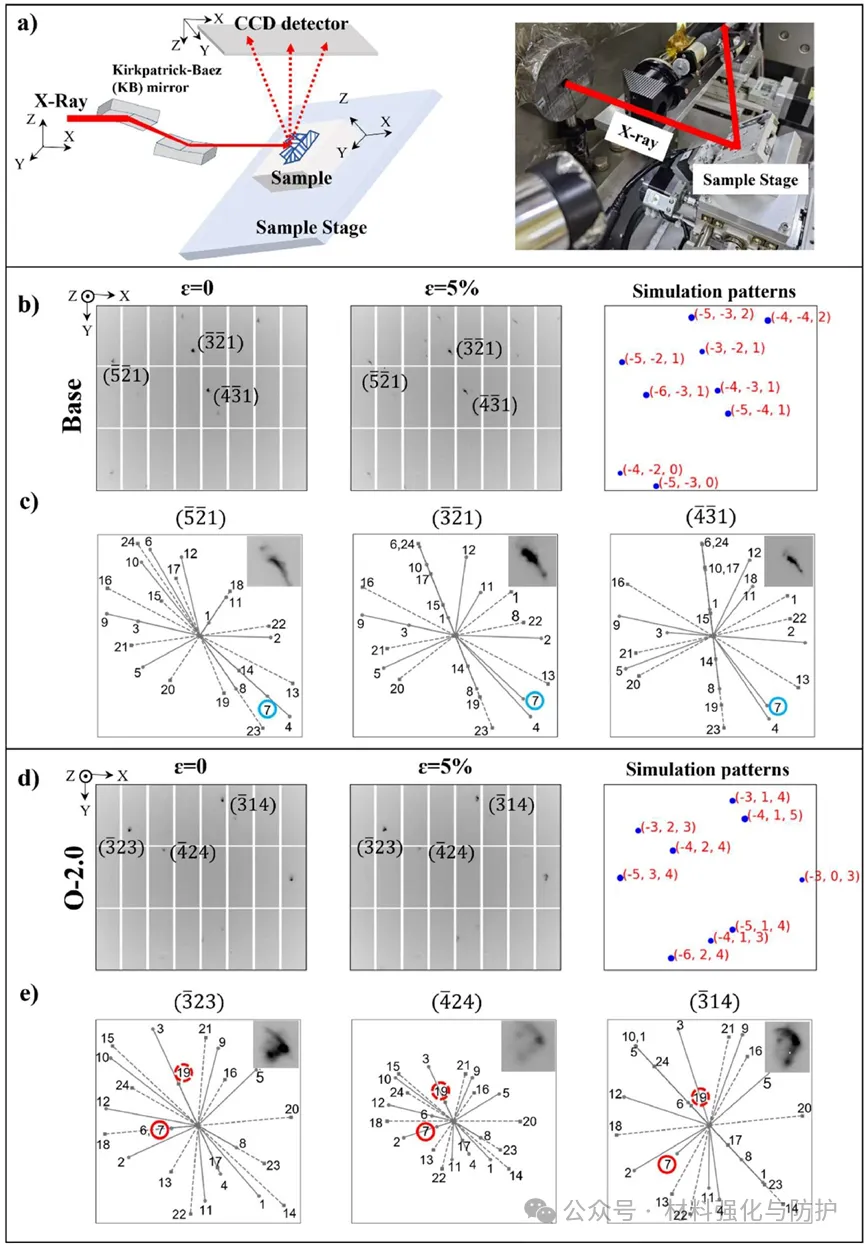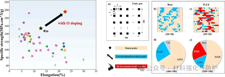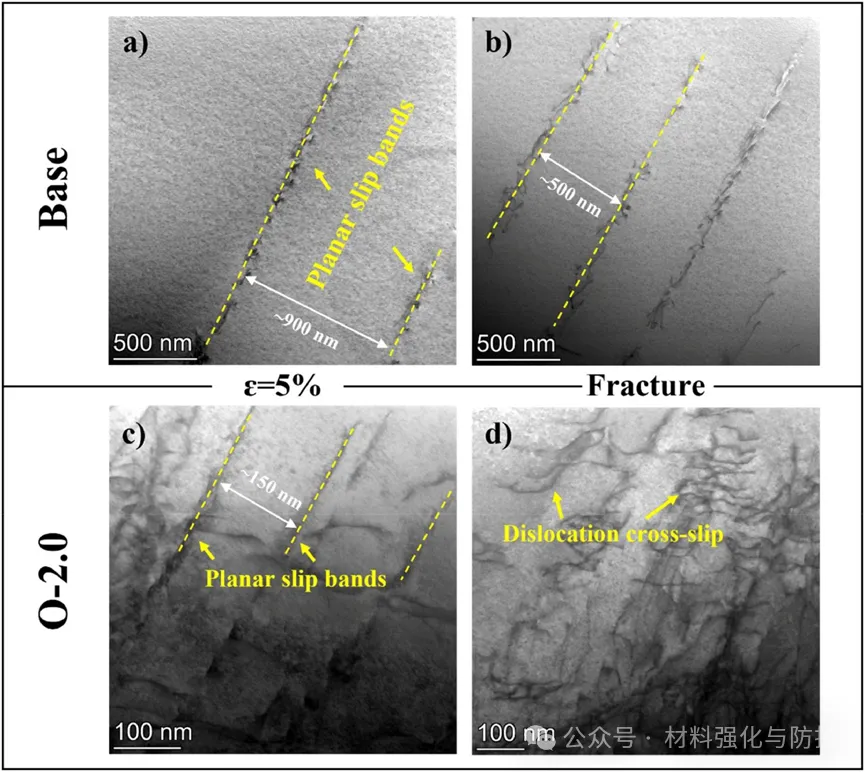 基体合金以平面滑移为主,区域占比26.5%,氧掺杂合金后平面滑移占比降低到了13.9%,而交滑移占比达23.6%。密度泛函理论(DFT)计算表明,氧使合金堆垛层错能(SFE)从407mJ/m2提升至1354mJ/m2,增幅达到了233%,远超交滑移激活阈值(700mJ/m2),促进了位错交滑移以改善塑性。另外,氧通过间隙固溶强化提升强度,氧原子引发显著四方晶格畸变,经Labusch模型估算,氧使强度提升量为152.3MPa,该值与实验值(164MPa)高度吻合。