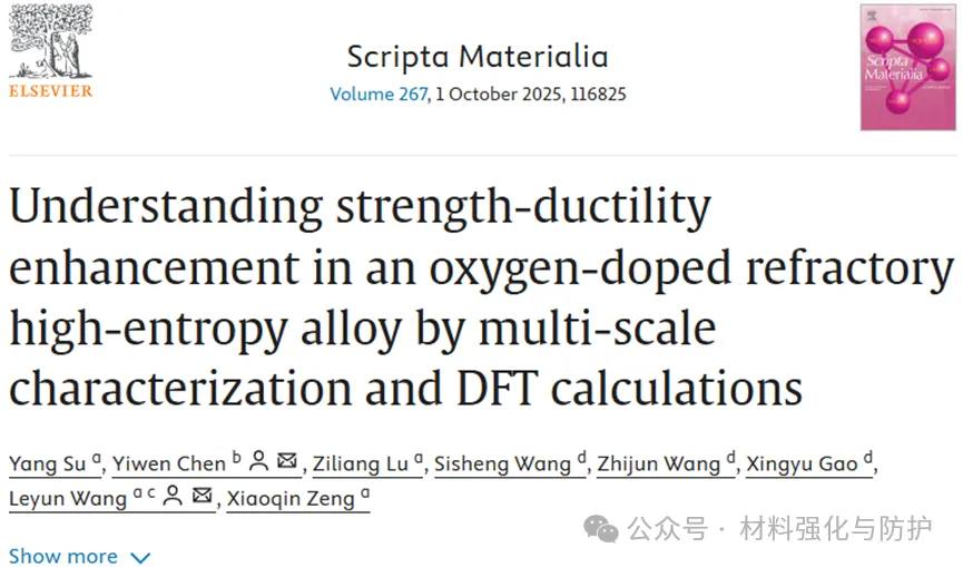 氧掺杂使合金屈服强度从944MPa提升至1108MPa、拉伸伸长率从12.8%增加到了22.9%,且保持合金的单相BCC结构和约70μm的相近晶粒尺寸,其机制为氧通过间隙固溶强化提升强度,同时使堆垛层错能从407mJ/m2升至1354mJ/m2以促进位错交滑移、改善塑性,并证实氧间隙工程是突破RHEAs强度和塑性权衡的有效策略。