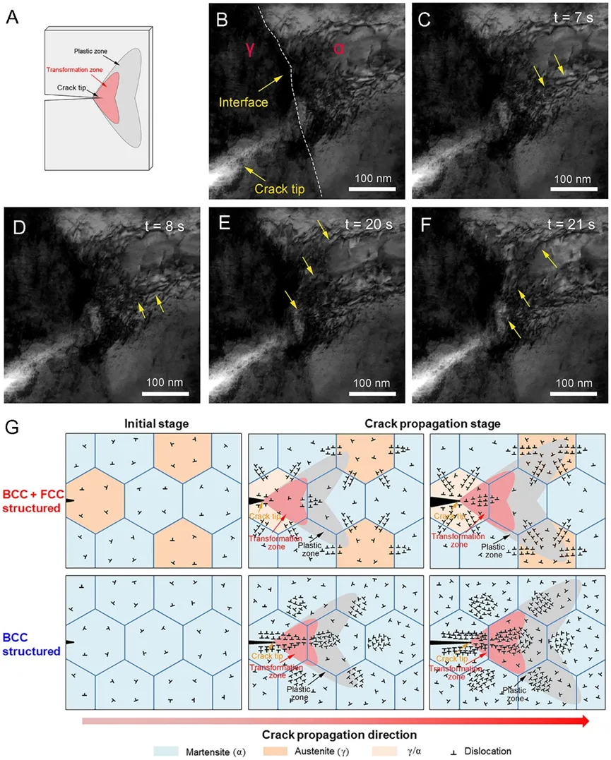 该研究首次观察到了裂纹前端中大量位错吸收(DACF)现象和马氏体/奥氏体界面位错传输(DAMAI)效应,前者缓解了α及界面应力集中和阻碍了裂纹扩展,后者提升了材料的延展性,二者协同作用突破了合金强韧性权衡难题。