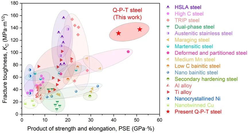 这项研究中的Q-P-T钢具有回火马氏体和残余奥氏体的异质结构,存在DAMAI效应和DACF现象,使钢材钢材的强塑积超过了50GPa・%,断裂韧性也超过130MPa・m¹/²,该性能不仅优于现在已有的低合金钢,而且成本低、容易生产,具有较高的价值。