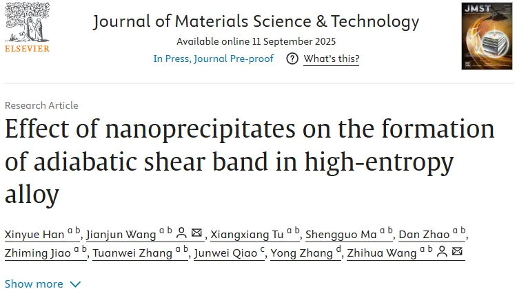 2025年9月11日,太原理工大学与福耀科技大学合作的研究成果在国际材料领域权威期刊《Journal of Materials Science & Technology》上在线发表,论文题为“Effect of nanoprecipitates on the formation of adiabatic shear band in highentropy alloy”。这项研究聚焦于高熵合金在动态高应变率条件下内部ASB的形成机制,研究团队通过调控L12型纳米析出相的尺寸及体积分数,系统探究了FCC基CoCrFeNiTi0.2高熵合金在高应变率下的动态剪切行为,该论文的两位通讯作者为太原理工大学的王建军副研究员和王志华教授。