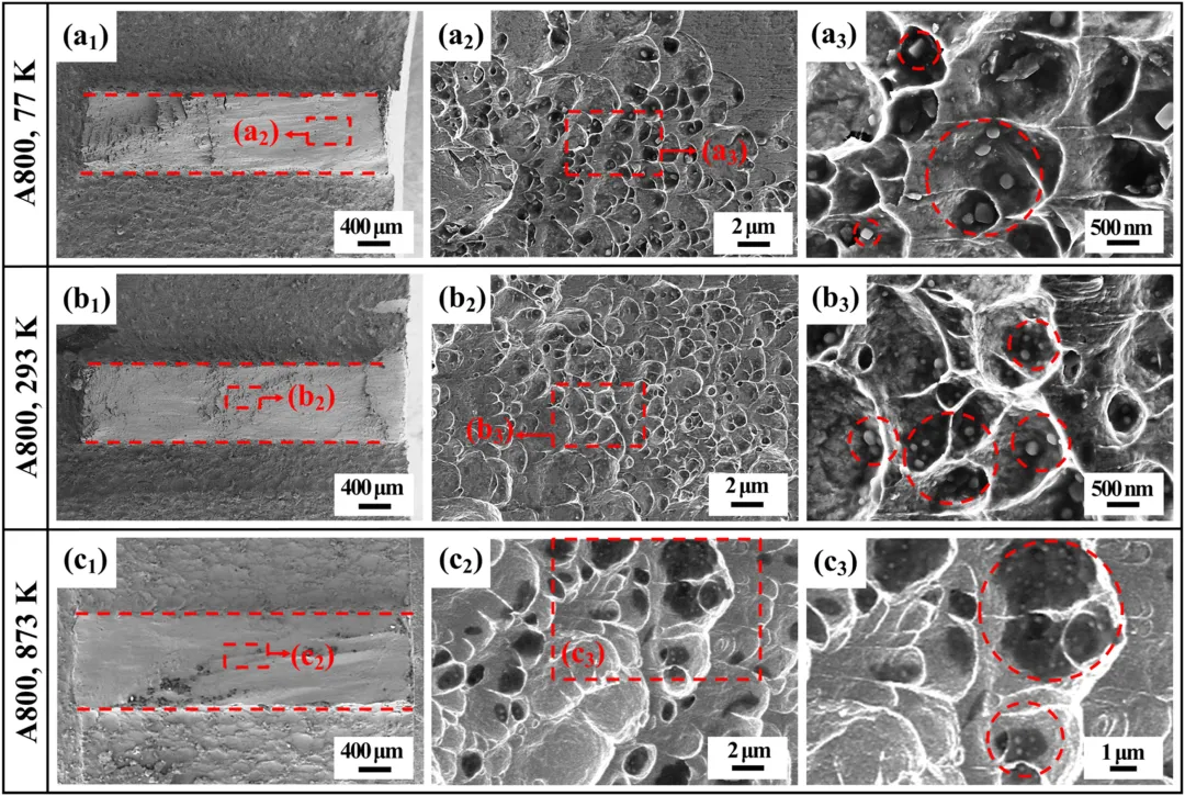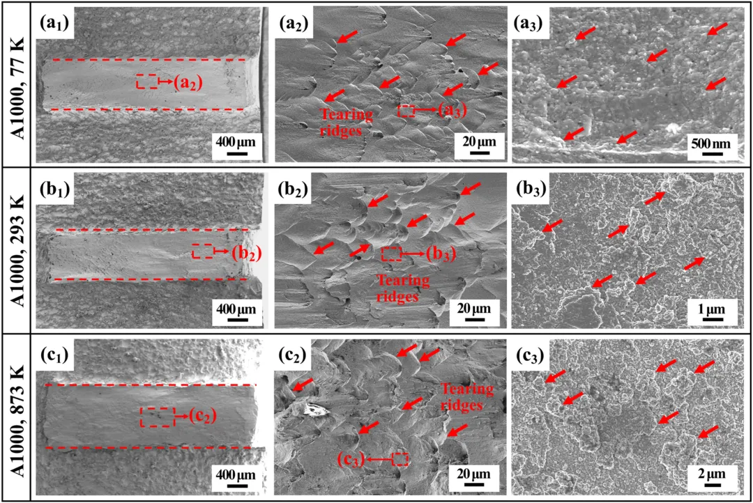 A1000 HEA断口呈细密撕裂脊,与ASB细晶区对应,A800 HEA断口粗糙、伴阶梯状突起与大量以L12析出相为核的韧窝,显示出不同失效机制。