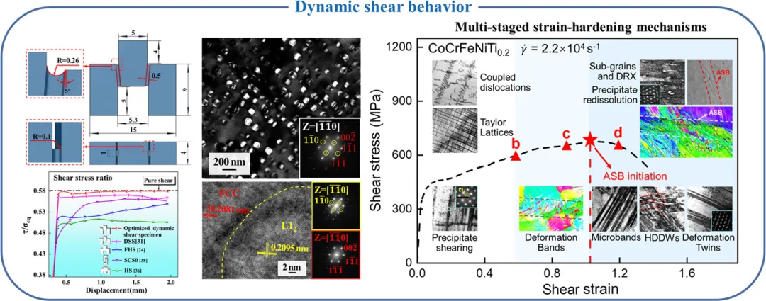 材料在高速、冲击、高温等极端工况下,容易发生宏观上瞬间的失效,这种失效对于正式服役的结构材料而言是极具灾难性的,而在材料内部这种失效其实是有预兆的,即形成的绝热剪切带便是这种失效即将发生的关键信号。近年来,高熵合金(HEAs)因其独特的高熵设计策略,相比于传统的合金材料,HEA更容易在强塑方面达到更高程度的平衡,且这一平衡具有良好的高温稳定性,因此HEA被视为抗热软化和抵御局部损伤的理想候选材料体系之一。然而,如何在高应变率条件下同步协同其强塑性及剪切稳定性,同样是HEA亟待解决的问题之一,目前有观点认为具有优异高温稳定性和强化效果的L12型多元纳米析出相有望通过抑制ASB的形成,为解决这一问题提供新路径。
