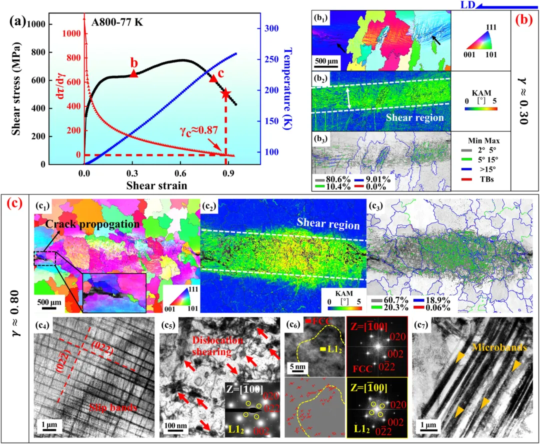团队首先基于有限元优化了动态剪切试样几何,使剪切区应力状态接近纯剪切,随后在分离式霍普金森压杆(SHPB)装置上分别于77K、293K和873K进行动态剪切实验,并结合EBSD/TEM对不同剪切应变下的微观演化进行“冻结”截取分析。