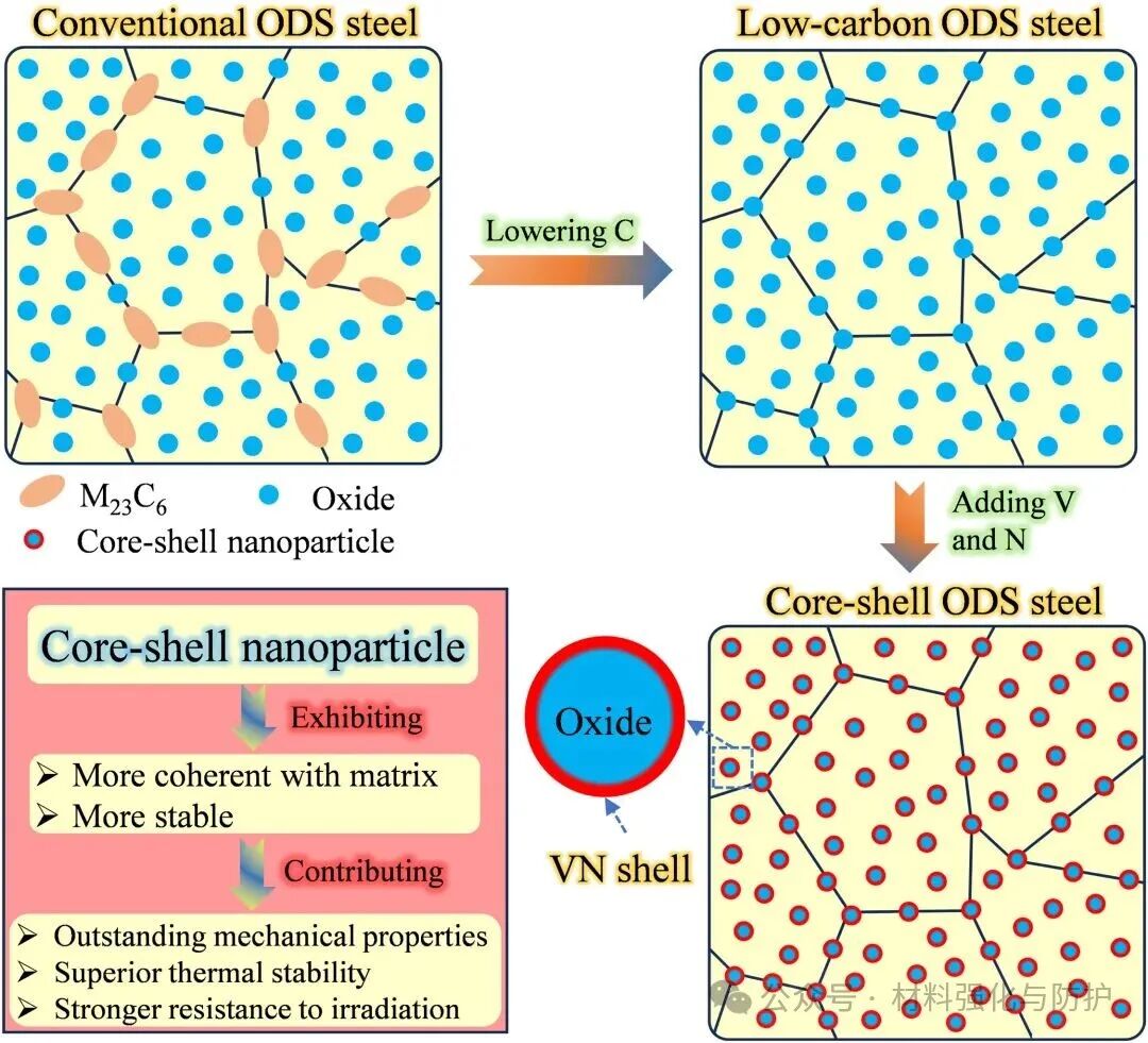 核-壳结构纳米颗粒在ODS钢中的设计示意图