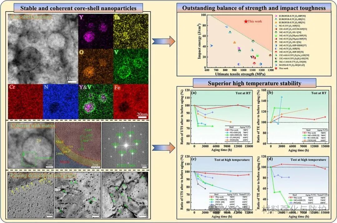 针对这一挑战,中科院金属研究所与中国科学技术大学联合山东大学的宋克鹏研究员提出在9Cr-ODS钢中构建纳米级“核-壳”(core–shell)复合弥散颗粒结构,利用Y3TaO7作为强化核心,以VN形成稳定外壳,不仅实现了界面完全相干和高位错钉扎效率,还能有效抑制元素扩散和颗粒粗化。基于这一创新设计,团队成功制备出一种强度约1028MPa,韧性约87.5J/cm²,并在700℃下长时服役15000h后仍几乎无性能衰减的新型ODS钢,性能远超传统ODS钢和F/M钢。这一成果以“Enhanced strength-toughness synergy and high temperature stability of a novel ODS steel with core-shell nanoparticles”为题于近期发表在国际材料领域权威期刊《Journal of Materials Science & Technology》,通讯作者为中科院金属所的李艳芬研究员。