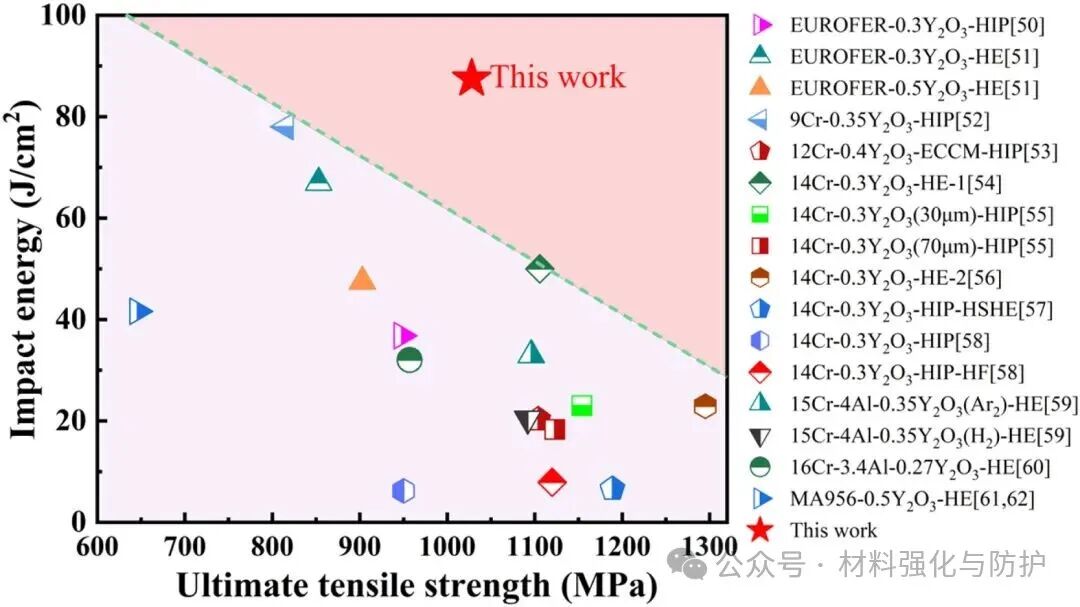 9Cr-ODS钢与其他ODS钢的UTS和冲击能对比